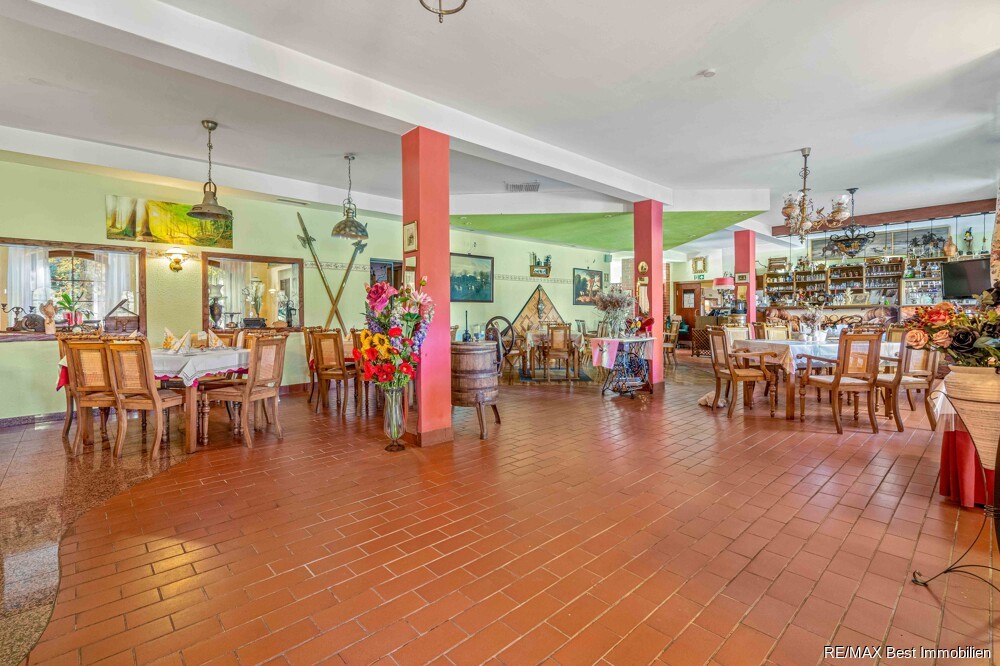 - Restaurant: Platz für ca. 100 Personen, Bar, Rezeption und Garderobe