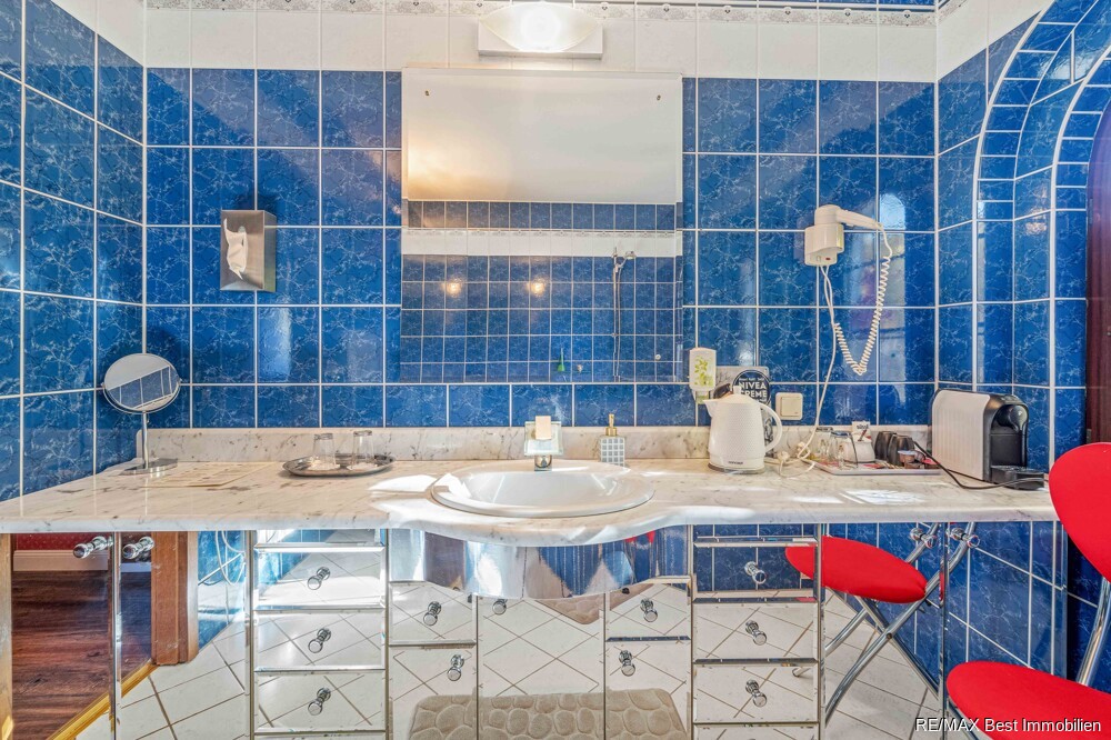 Die Innenausstattung besticht durch hochwertige Materialien wie großformatige Fliesen und geschliffenen Natursteinbelag, die sowohl für die Fußböden als auch für die Treppen und Wände verwendet wurden.