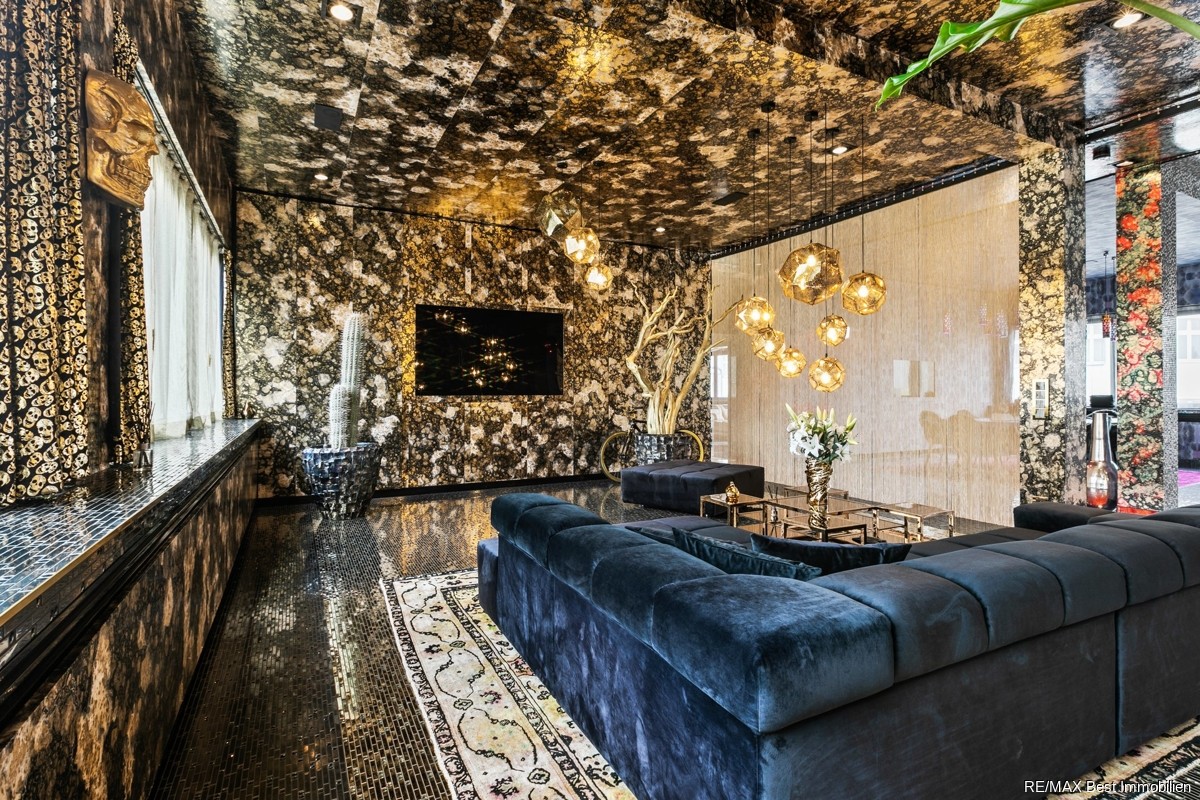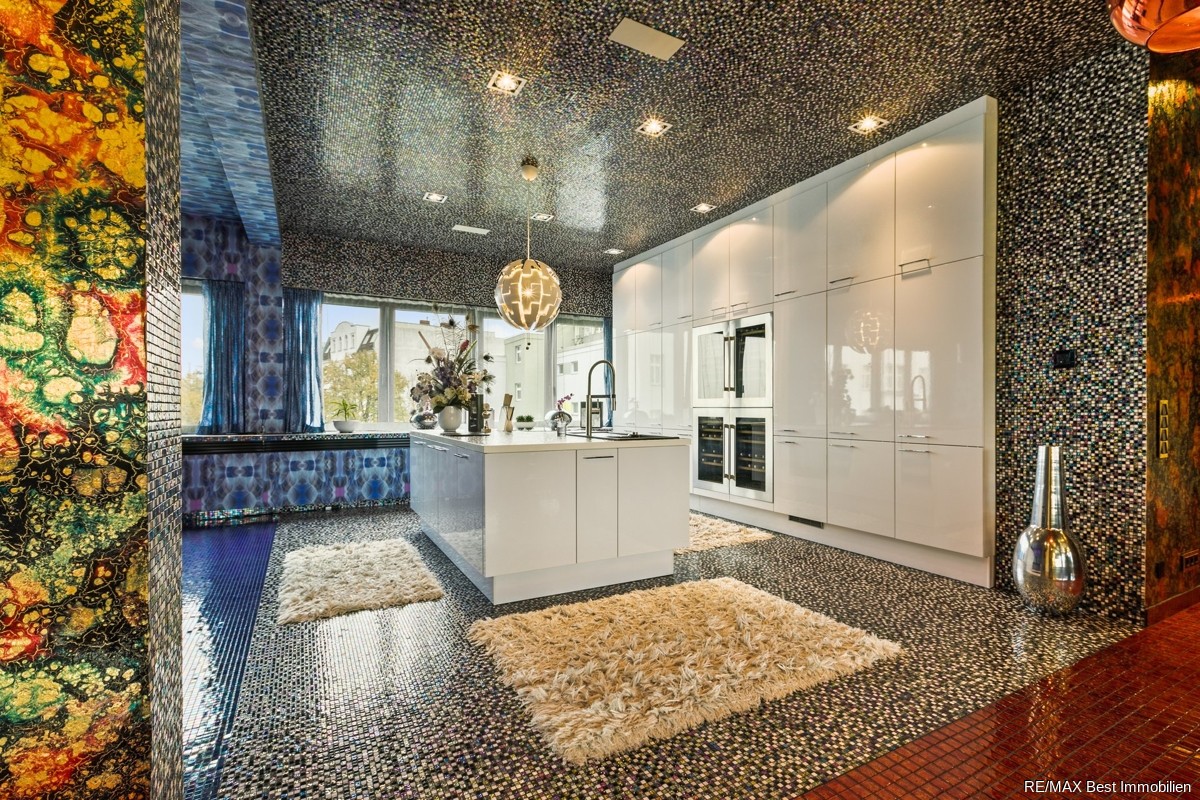 Jeder Raum ist ein in für sich perfektes Design-Unikat. Alle Räume sind entweder vollständig gefliest oder verfügen über eine zu den Fliesen passende Tapete. Alle Heizkörper sind verkleidet und ebenso wie die Fenster in der Farbe des jeweiligen Raumes gestrichen. Teilweise sind die Decken in den Räumen abgehangen und mit Spots sowie Lautsprechern bestückt.Zwei Räume sind ganz klar als Herzstück und Highlight der Immobilie auszumachen. Zum einen der ca.161,55 m² große Wohn/Ess-Bereich, welcher über einen Elektro-Kamin, ein Video- und Soundsystem sowie über eine luxuriöse Einbauküche mit Markengeräten und Küchenblock verfügt. Zum anderen das Masterbad, in welchem Sie sich durch die freistehende Whirlpool-Badewanne, die große Sauna, 2 Regenduschen und mit Blattgold verzierte Fliesen, wie in einer Wellnessoase fühlen werden.