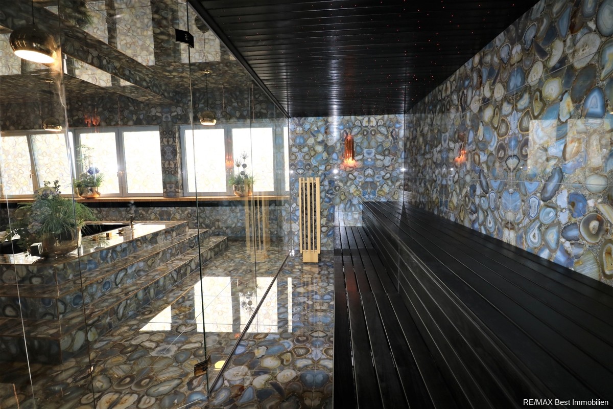 - Achat-Design-Fliesen / Doppelbadewanne / Sauna mit schwarzem Holz, goldenen Saunaöfen und Sternenhimmel /