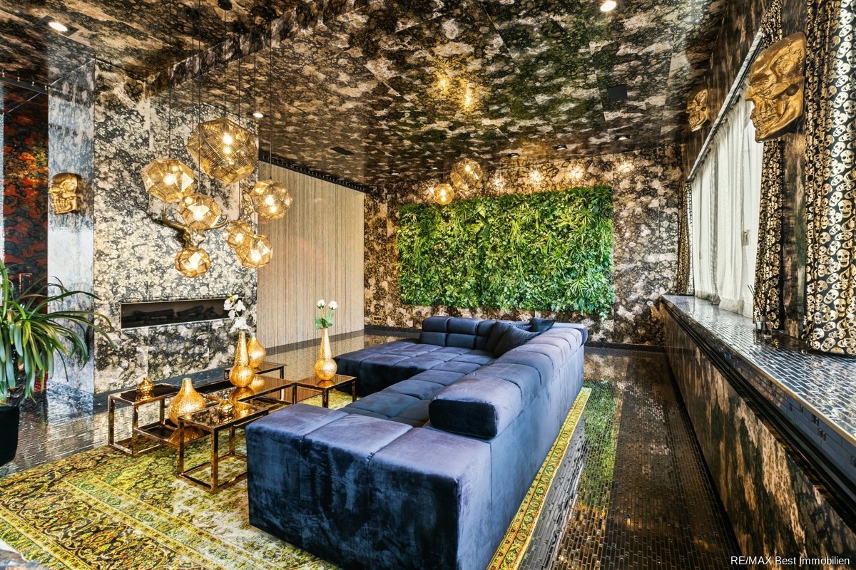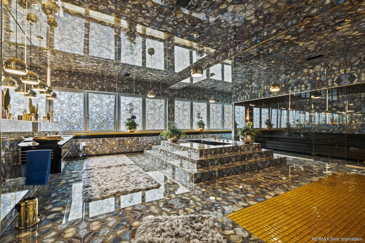 Jeder Raum ist ein in für sich perfektes Design-Unikat. Alle Räume sind entweder vollständig gefliest oder verfügen über eine zu den Fliesen passende Tapete. Alle Heizkörper sind verkleidet und ebenso wie die Fenster in der Farbe des jeweiligen Raumes gestrichen. Teilweise sind die Decken in den Räumen abgehangen und mit Spots sowie Lautsprechern bestückt.Zwei Räume sind ganz klar als Herzstück und Highlight der Immobilie auszumachen. Zum einen der ca.161,55 m² große Wohn/Ess-Bereich, welcher über einen Elektro-Kamin, ein Video- und Soundsystem sowie über eine luxuriöse Einbauküche mit Markengeräten und Küchenblock verfügt. Zum anderen das Masterbad, in welchem Sie sich durch die freistehende Whirlpool-Badewanne, die große Sauna, 2 Regenduschen und mit Blattgold verzierte Fliesen, wie in einer Wellnessoase fühlen werden.
