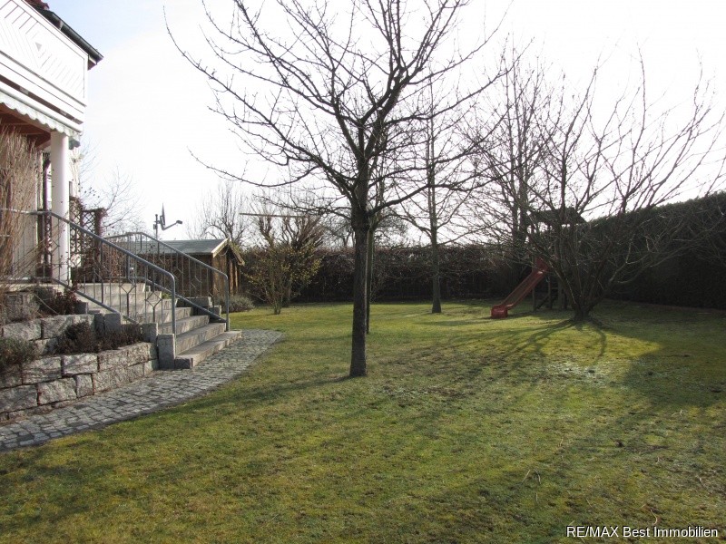 - Schön angelegter Ziergarten, Blockbohlengerätehaus