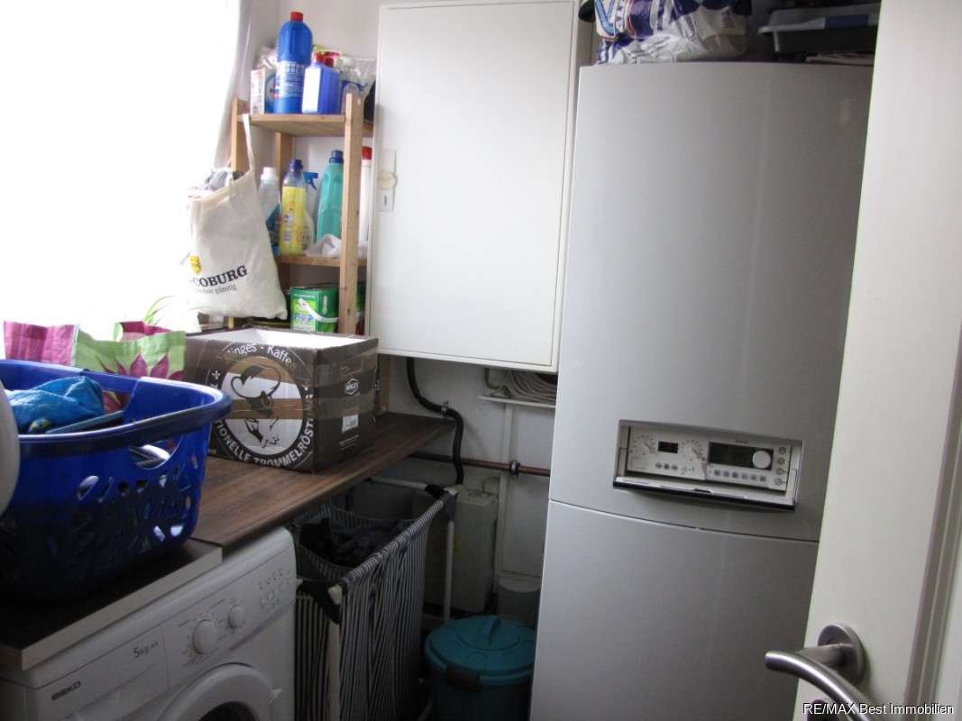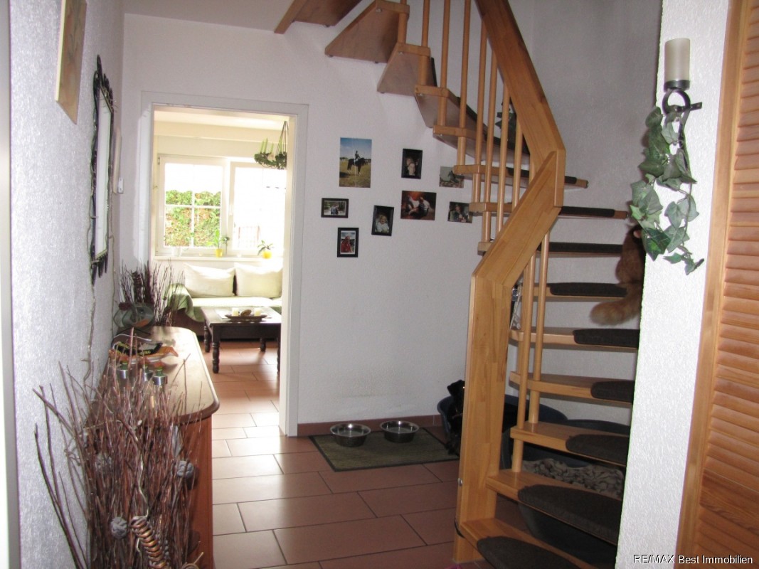 Die Fenster im EG sind alle mit elektrischen Jalousien ausgestattet. Im EG und im 1.OG befindet sich Fussbodenheizung, die durch ein Gasbrennwertgerät der Fa. Buderus betrieben wird. Das gesamte EG ist mit Fliesen und die Obergeschosse sind, bis auf das Bad, mit Laminat ausgestattet. Die Küche der Fa. Leicht ist mit Einbaugeräten der Fa. Küppersbusch und Bosch ausgestattet. Vom Wohnbereich aus gelangt man barrierefrei durch eine 1,80 m breite Terrassentür in den uneinsehbaren Gartenbereich. Die Terrasse ist mit einer Markise versehen. Im Garten befinden sich zwei massiv errichtete Geräteschuppen inkl. Stromversorgungen. Das Bad im OG ist mit Handtuchheizkörpern und einer weiteren Dusche ausgestattet.Sonstige Angaben: