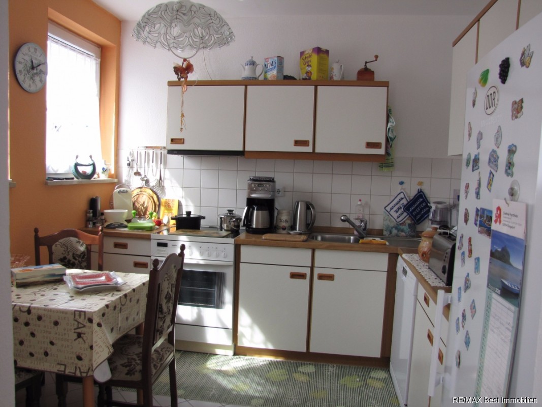 Die Fußböden der Wohnräume sind mit Laminat, die Küche mit Fliesen in weiß, ausgestattet. Die Fenster sind aus PVC. Die Wände der Räume sind mit Rauhfaser tapeziert. Eine Einbauküche ist vorhanden. Warmwasser wird über einen Durchlauferhitzer erzeugt. Zur Wohnung gehört ein Balkon.Sonstige Angaben:
