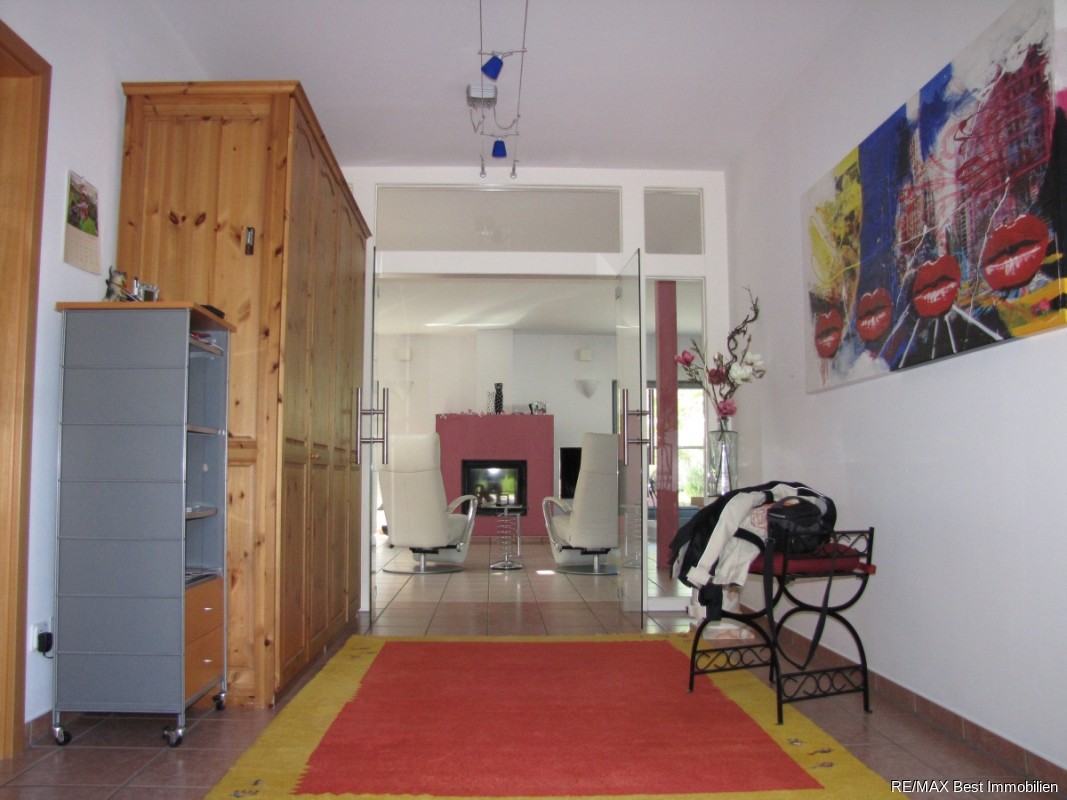 - Diele mit Fachwerk, Verglasung und Glastüren;