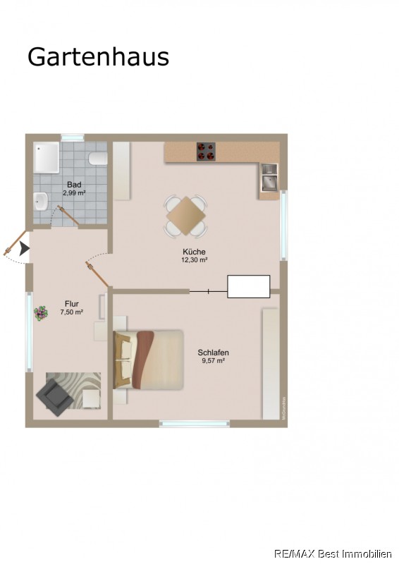 Das Gartenhaus verfügt über ein kleines Badezimmer mit Dusche, Küche (inkl. EBK) und Schlafzimmer. Strom, Wasser und Heizung ist vorhanden. Die Warmwasseraufbereitung erfolgt hier über einen Durchlauferhitzer.