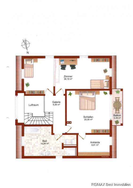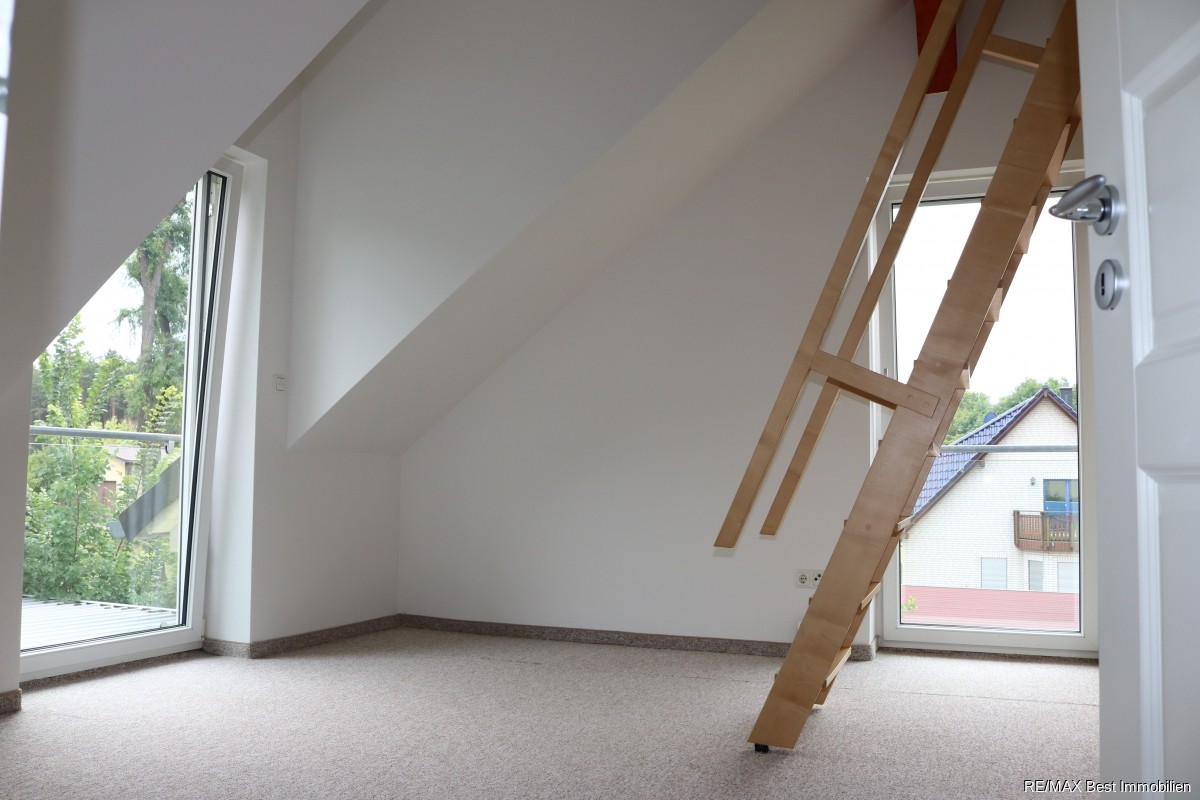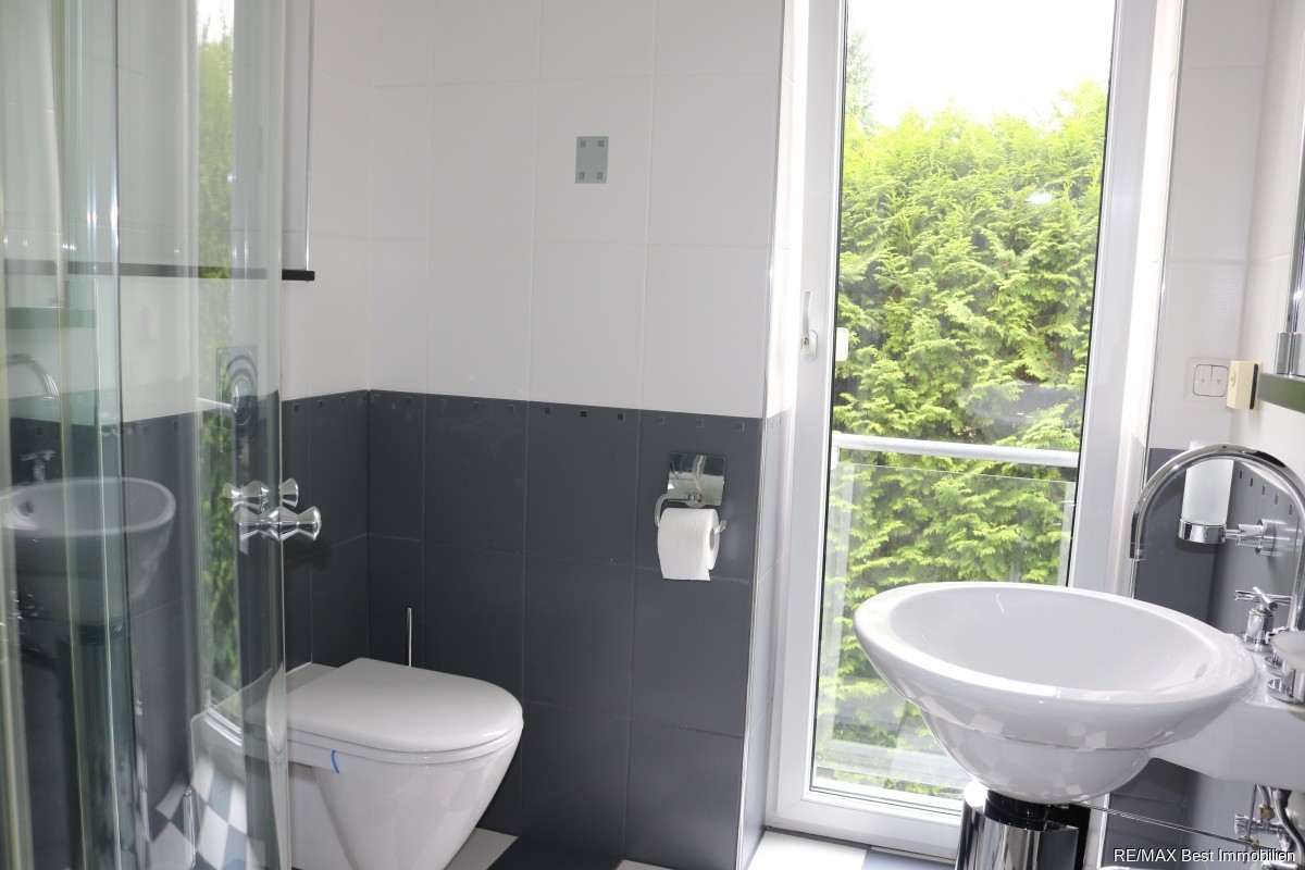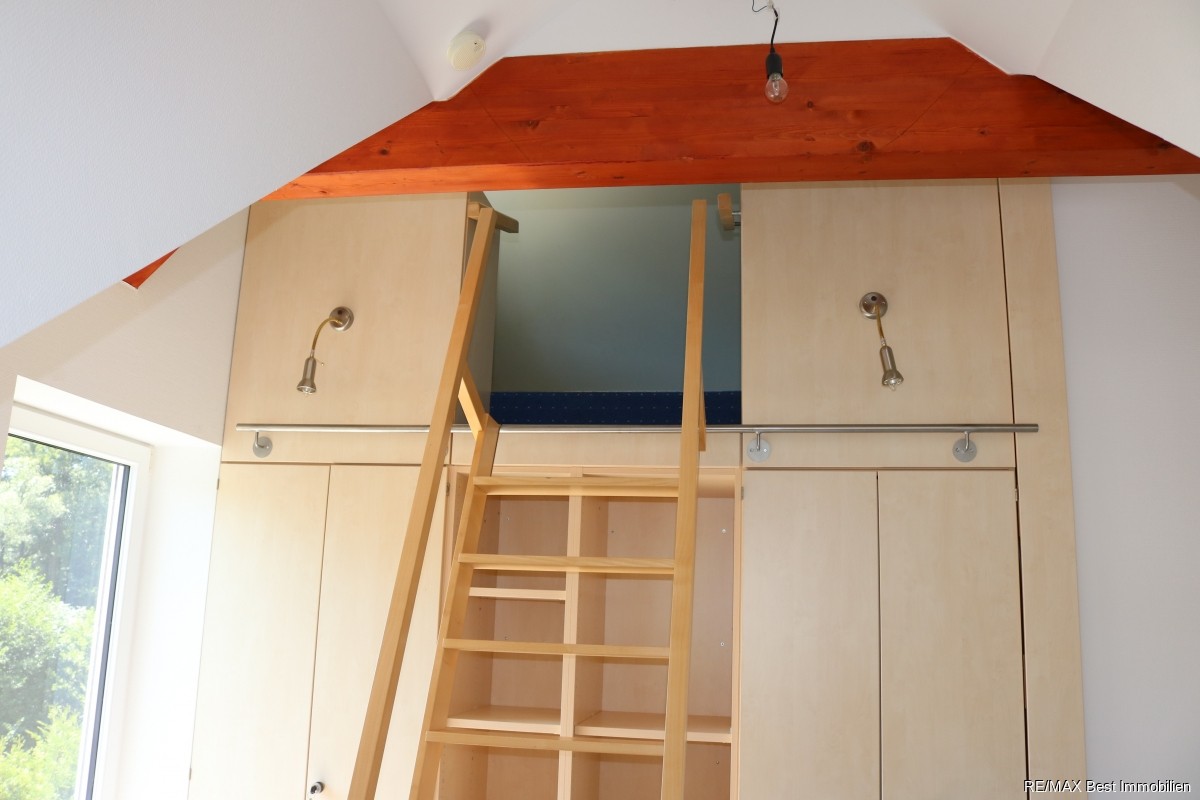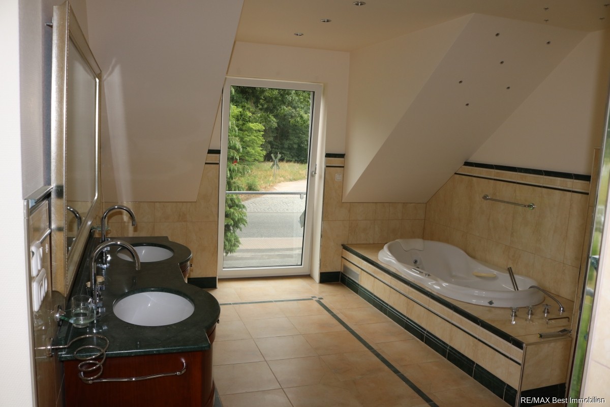 Das hochmoderne und geräumige Bad mit Wanne, Dusche und Whirlpool bietet Ihnen alles, was das Herz begehrt. Vom Flur aus blicken Sie auf eine Galerie und das helle, offene Treppenhaus. Von einem Zimmer aus, gelangen Sie über eine Luke mit Einschubtreppe in den nicht ausgebauten Spitzboden.