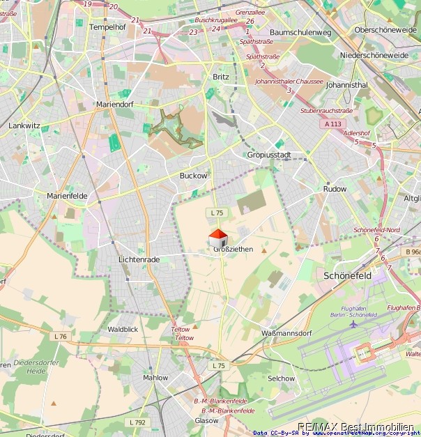 Diese Immobilie befindet sich im Herzen von Großziethen, einem Ortsteil der Gemeinde Schönefeld. Über Großziethen erreichen Sie in kürzester Zeit die Berliner Bezirke Rudow, Lichtenrade und Buckow.Bis zur Berliner Stadtgrenze sind es keine zwei Kilometer.
