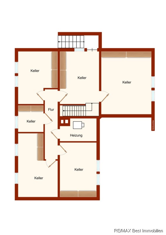 Der Vollkeller mit seiner Wohn/Nutzfläche von ca. 100 m² ist als Souterrain voll belichtet und beheizt ausgebildet. Mit einer Geschosshöhe von knapp ca. 2,50 m und einer Sockelhöhe von ca. 1,20 m ist er hervorragend für Wohnen/Gewerbe nutzbar. Das Souterrain ist auch von außen über eine separate Eingangs-Treppe erreichbar.