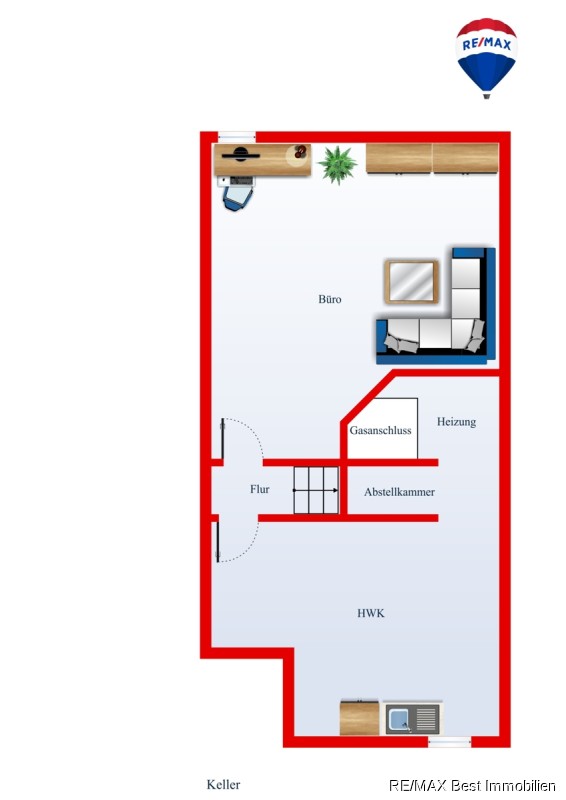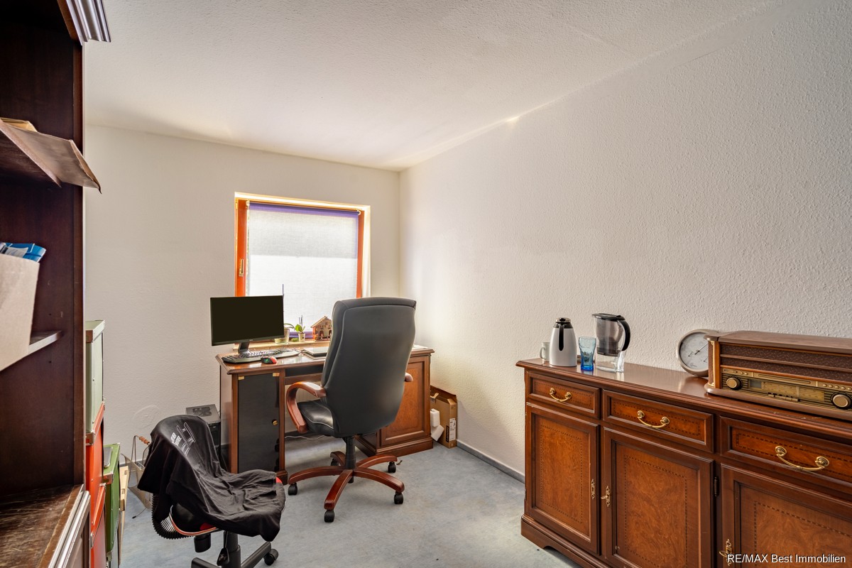 Im trockenen und beheizten Keller befindet sich neben dem Heizungsraum und der Waschküche ein ca. 27 m² großer Hobbyraum, der aktuell als Büro genutzt wird.