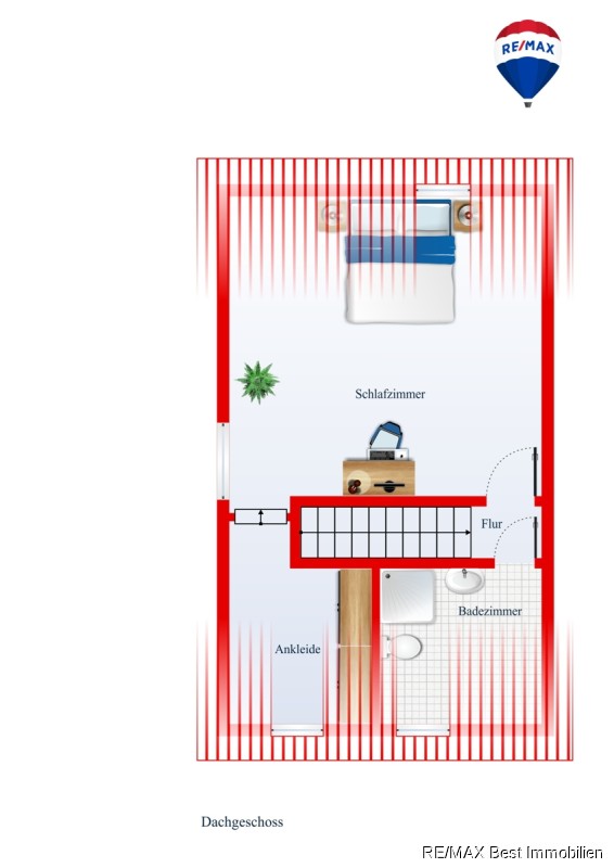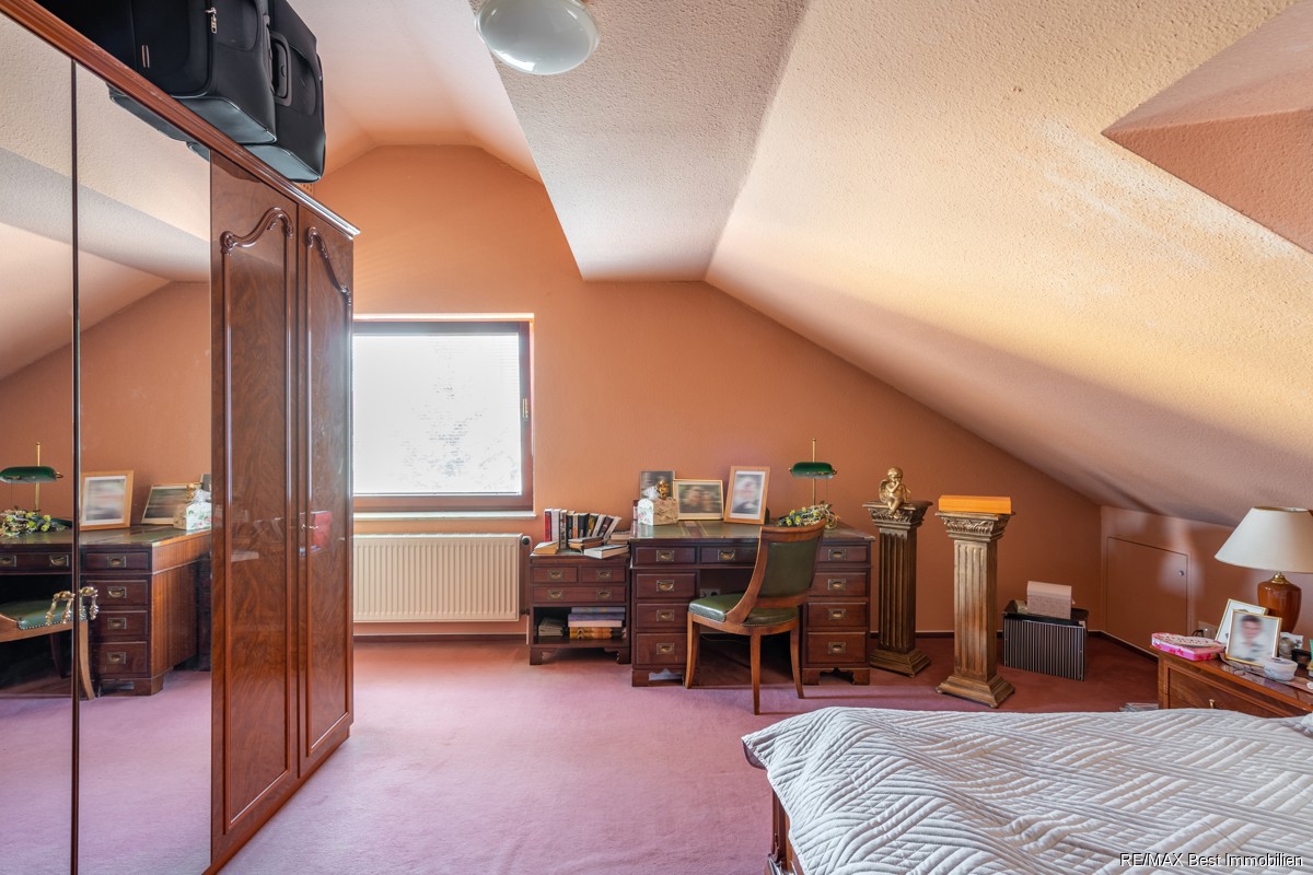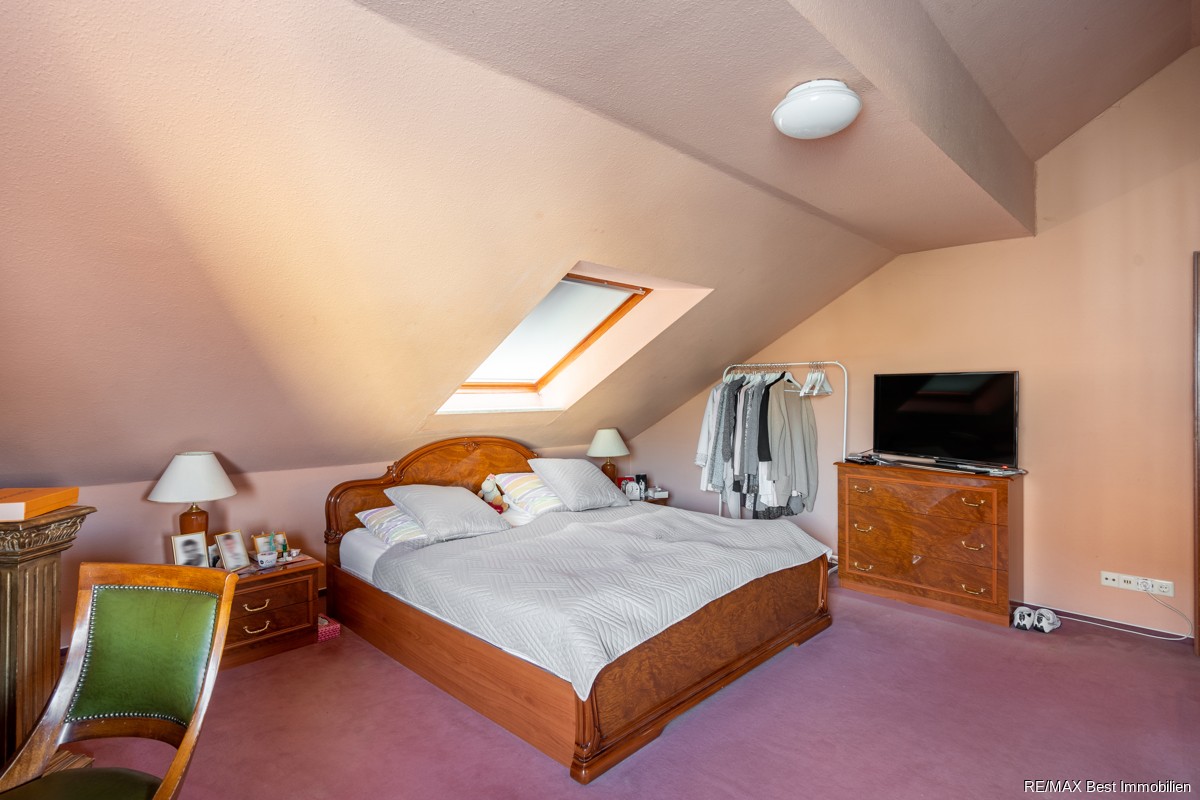 Das Dachgeschoss wurde ausgebaut und verfügt über ein Schlafzimmer mit separater Ankleide und ein Badezimmer mit Dusche auf einer Fläche von ca. 27 m².
