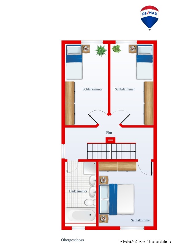 Das Obergeschoss mit ca. 51 m² Wohnfläche ist unterteilt in drei ca. 12 m² große Zimmer, Flur und ein Badezimmer mit Badewanne.