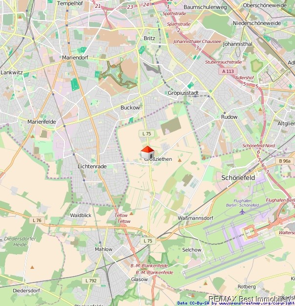 Diese Immobilie befindet sich im Herzen von Großziethen, einem Ortsteil der Gemeinde Schönefeld. Über Großziethen erreichen Sie in kürzester Zeit die Berliner Bezirke Rudow, Lichtenrade und Buckow.Bis zur Berliner Stadtgrenze sind es keine zwei Kilometer.