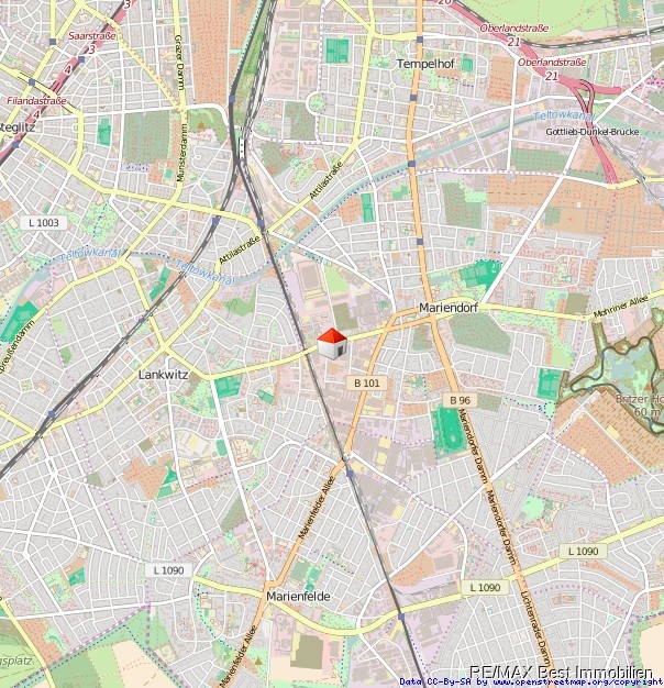 Die Wohnung befindet sich im Berliner Bezirk Tempelhof-Schöneberg im Ortsteil Mariendorf direkt gegenüber vom alten Mariendorfer Gaswerk. Mariendorf liegt an der B96 zwischen dem nördlichen Ortsteil Tempelhof und den südlichen Ortsteilen Marienfelde und Lichtenrade.Einkaufsmöglichkeiten für den täglichen Bedarf sind in ca. 500 m zu Fuß erreichbar.