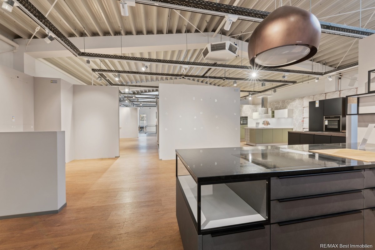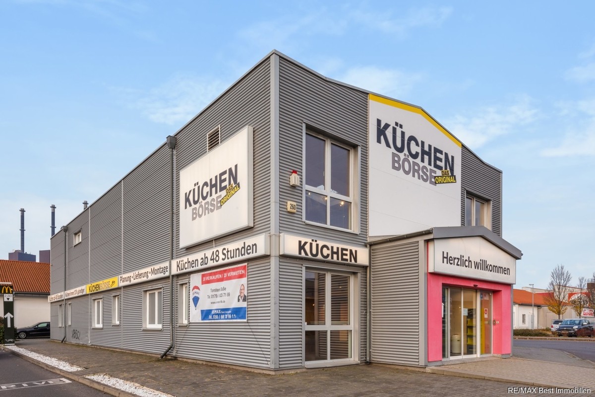 Bebaut ist das Grundstück mit einer 2-geschossigen Stahlblechhalle der Firma Temme Stahl-und Industriebau GmbH aus dem Jahre 2003, welche aktuell als Ausstellungshalle für ein Küchenstudio genutzt wird. Die gesamte Nutzfläche der Halle beträgt ca. 544 m², dabei fallen ca. 292,05 m² auf das Erdgeschoss und ca. 256,76 m² auf das Obergeschoss an. Die Raumhöhe der Geschosse beträgt jeweils ca. 3 m. Durch die derzeitige Nutzung als Küchenstudio ist der Grundriss verändert, kann jedoch durch die Leichtbauweise der Stellwände individuell angepasst werden, um so das Maximum an Nutzfläche für den jeweiligen Gebrauch herauszuholen. Im hinteren Teil des EG befinden sich das Büro, 2 getrennte WC`s sowie der Heizungs- und Elektroraum.