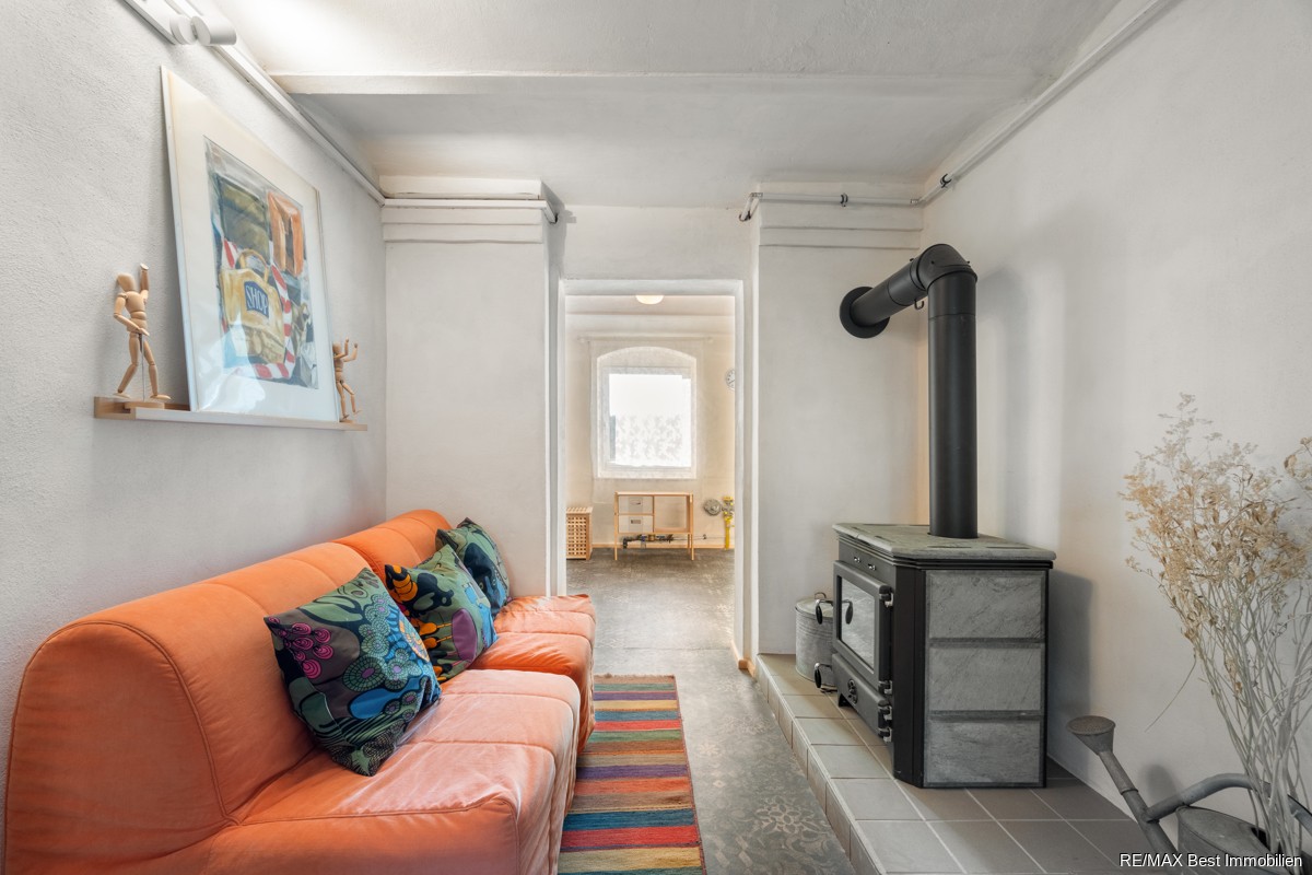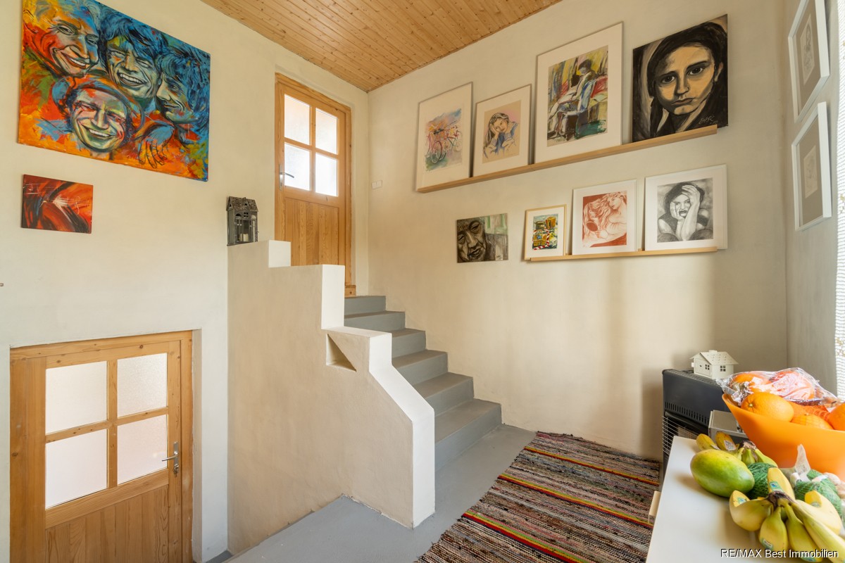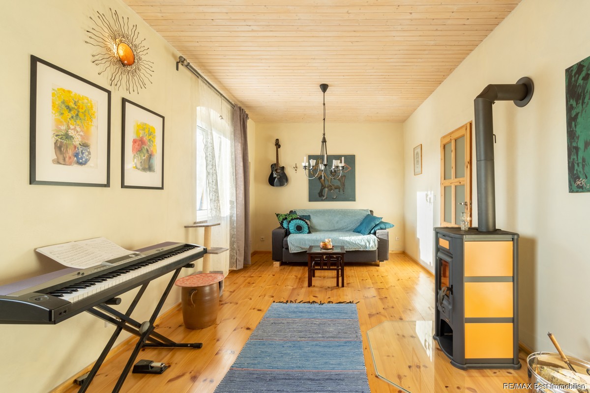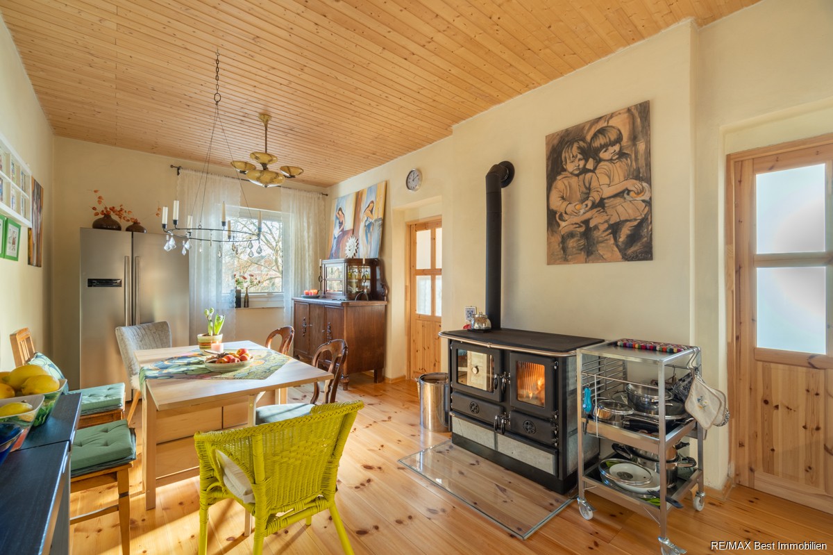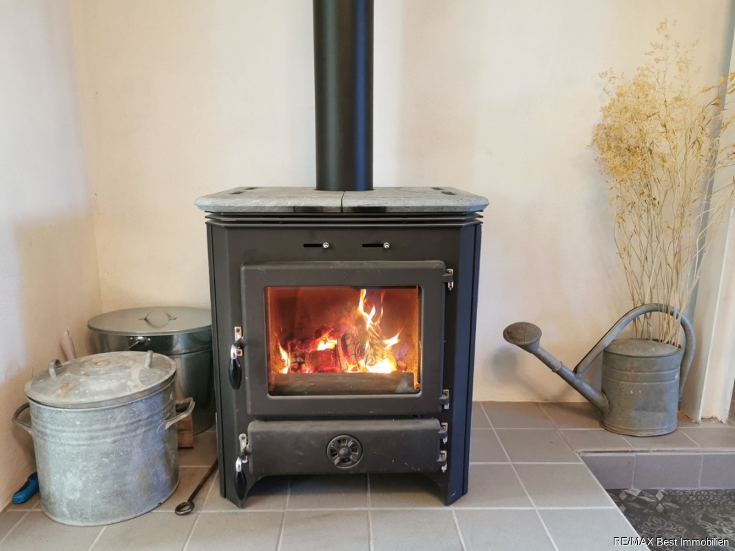 Über den breiten Treppenaufgang sind beide Wohnebenen erreichbar. Im Obergeschoss gelangt man in einen großzügigen hellen Flur von dem man das Badezimmer sowie die geräumige Wohnküche erreicht. Der große holzbefeuerte Ofen, auf dem auch gekocht werden kann, erzeugt eine mehr als heimelige Atmosphäre, die sich im ganzen Haus wiederfindet. Zudem verfügt das Obergeschoß über weitere drei Räume und einen zusätzlichen Kaminofen.