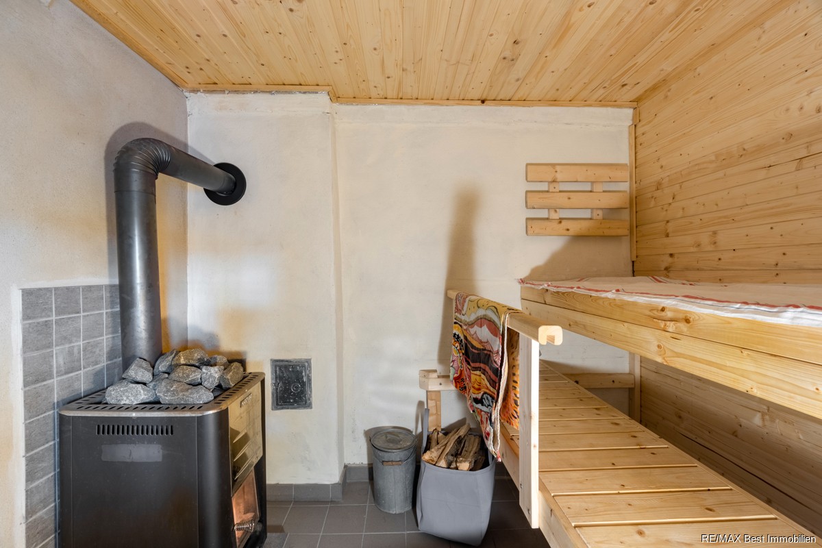 Ein Highlight im Erdgeschoss ist die Sauna mit original finnischem Saunaofen. Hier lässt es sich herrlich vom Alltag entspannen. Wenige Holzscheite reichen aus, um in kürzester Zeit auf angenehme 80 Grad hochzuheizen. Gleich nebenan kann man sich unter der Dusche erfrischen.