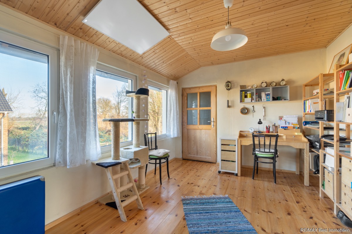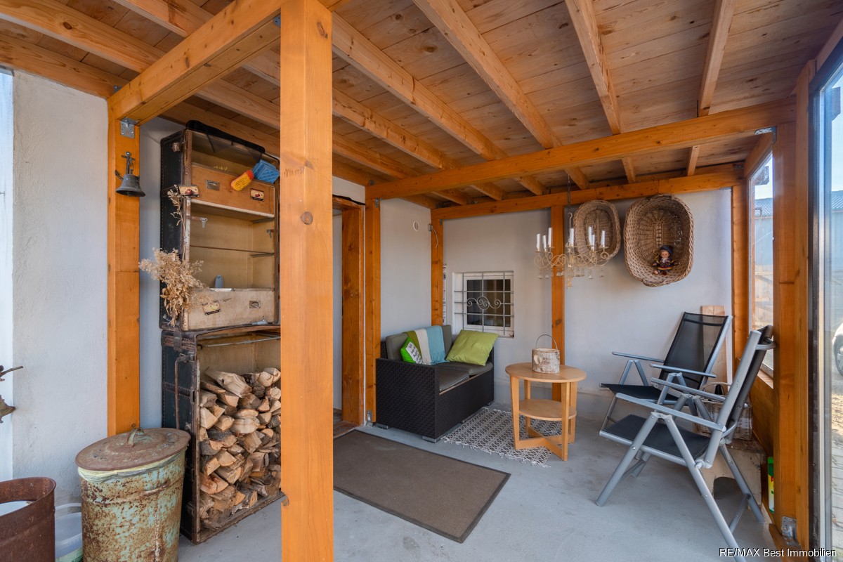 Das Erdgeschoss wird derzeit als Freizeit- und Gästebereich genutzt. Auch hier befindet sich ein großer gemütlicher Ofen, drei Zimmer und eine Gästetoilette. Vom hellen Flur aus gelangt man zudem nach draußen in den Garten mit gemütlicher Terrassenüberdachung.