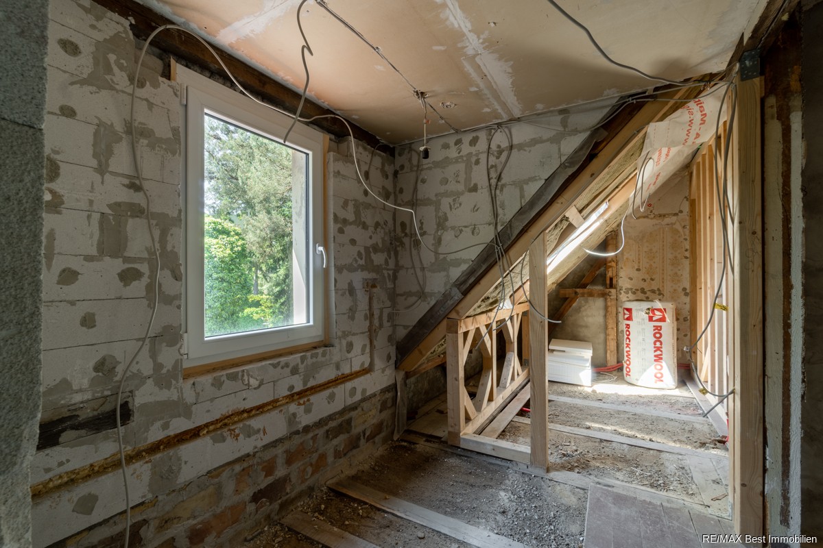 - Bodenarbeiten (EG: Schüttung und komplett gefliest; DG: Bad gefliest, Rest: Laminat)
