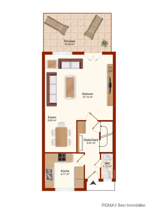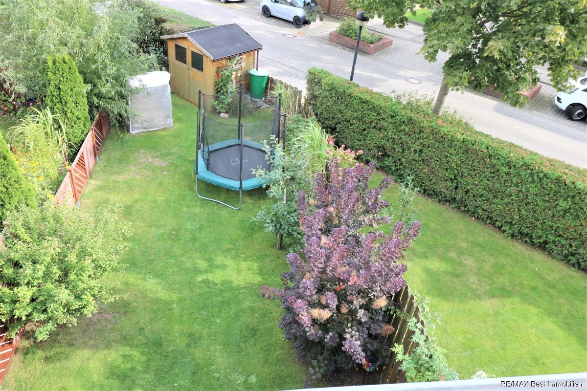 Im Erdgeschoss finden Sie einen separaten Flur, von dem aus die geschlossene Küche, ein Gäste WC, das Treppenhaus und das Wohnzimmer abgehen. Das helle, großzügige Wohnzimmer besticht durch einen zusätzlich offenen Essbereich. Durch die bodentiefen Fenster gelangen Sie über die Terrassentür auf die ca. 16 m² große Terrasse und in den Gartenbereich.