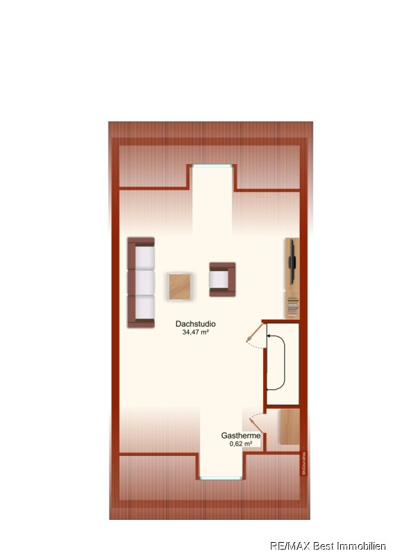 Das vollausgebaute Dachgeschoss verfügt über eine Wohnfläche von ca. 34 m² und einen kleinen separaten Raum, in dem sich die Gas-Zentralheizung befindet.