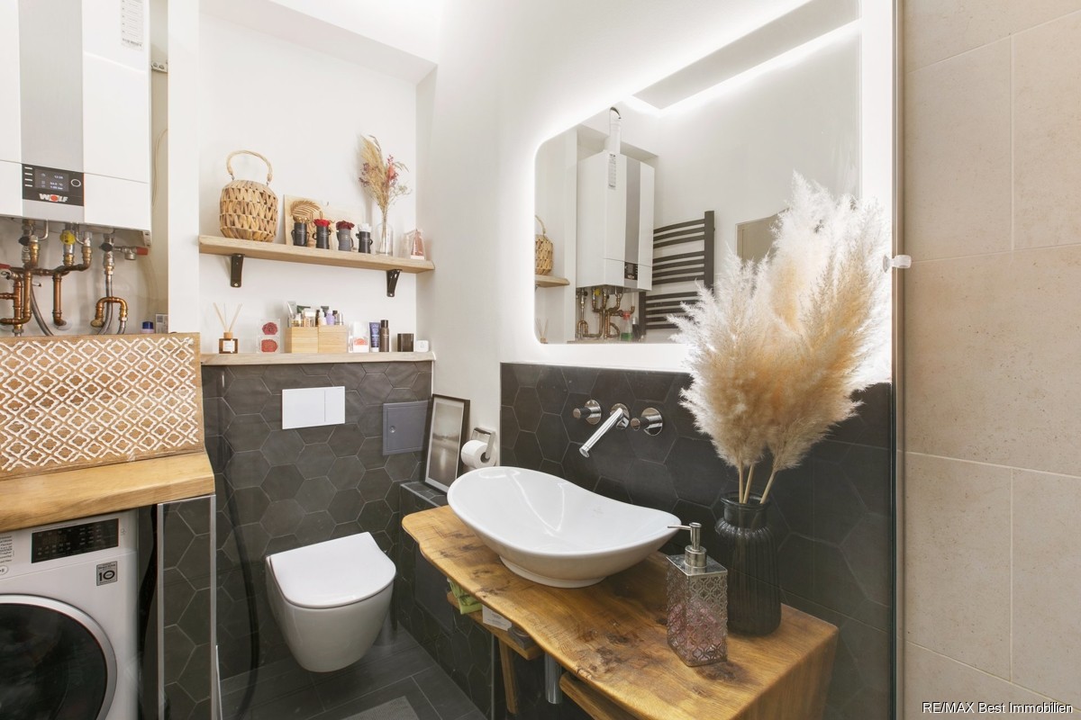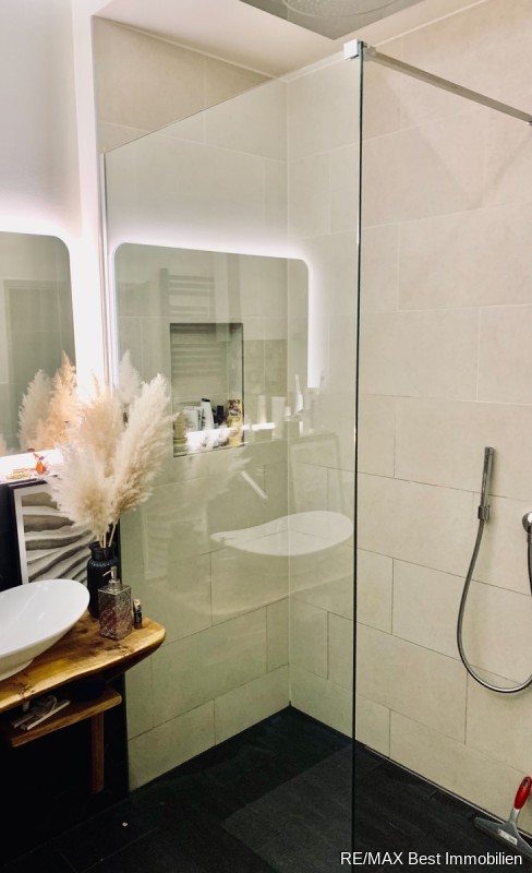 - Bad mit hochwertigen Fliesen und Fliesenspiegel