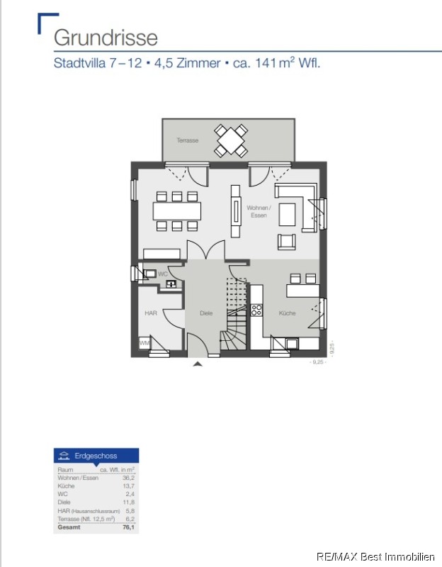 Die Stadtvillen verfügen über eine Wohnflächen von ca. 141 m². Im Erdgeschoss teilt sich diese in ein Wohn-/Esszimmer, eine Küche, ein Gäste-WC, die Diele und den Hausanschlussraum auf.
