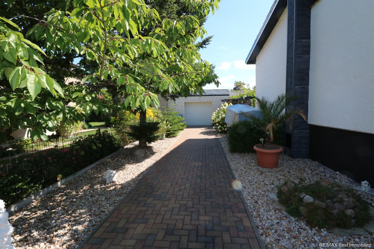 Eine Garage befindet sich neben dem Bungalow auf dem Grundstück.
