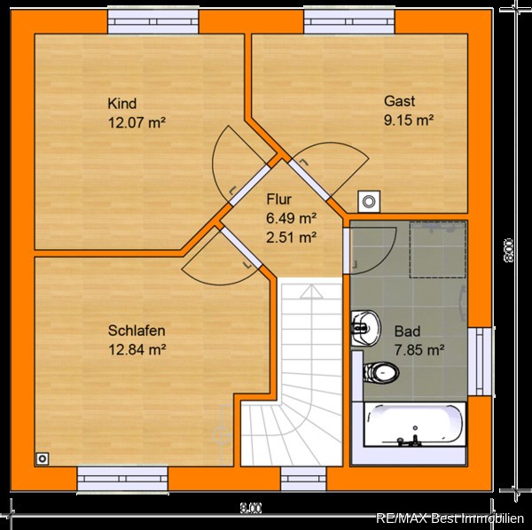 Das Außenmaß des geplanten EFH beträgt ca. 8x8 m, wodurch auf 2 Vollgeschossen eine Wohnfläche von ca. 96 m² entsteht. Aufgeteilt in jeweils ca. 48 m² Wohn-/Nutzfläche im Erdgeschoss und Obergeschoss. Im Erdgeschoss befinden sich neben dem Wohn-Essbereich noch Flur, WC und der Hauswirtschaftsraum. Im Obergeschoss teilt sich die Fläche in 2 Kinderzimmer, einem Schlafzimmer samt begehbaren Kleiderschrank, Flur und Badezimmer auf.