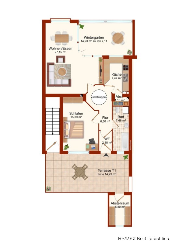 Vor dem Eingangsbereich der Wohneinheit befindet sich zudem eine ca. 28,5 m² große Terrasse.