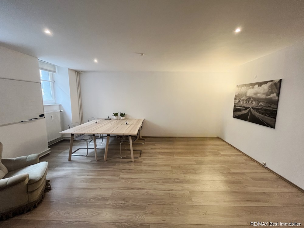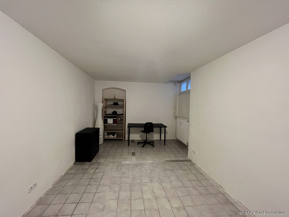 Die Gewerbeeinheit lässt sich durch einen eigenen Eingang vom Gehweg aus betreten und verfügt straßenseitig über zwei Fenster, von denen eines auch als Schaufenster dienen könnte.
