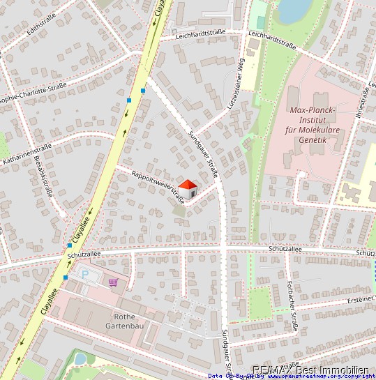 Clayallee verkehrende Buslinien mit ca. 400 m entfernten Haltestellen erreichbar