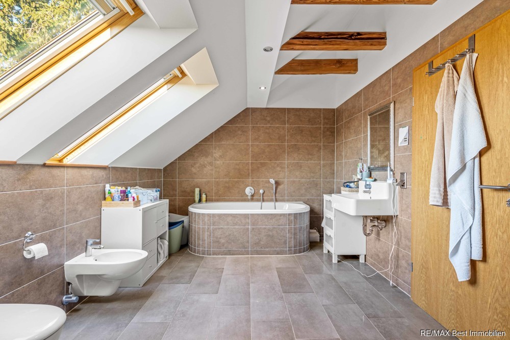 - Badezimmer gefliest, mit Dusche und Wanne, 2 Waschbecken sowie Waschmaschinenanschluss