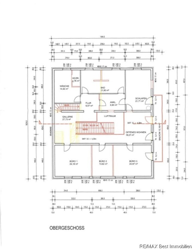 Wie im Erdgeschoss erreichen Sie auch im Obergeschoss alle Zimmer vom zentralen Flur aus. Dies entspricht einer idealen Raumaufteilung für Büros oder Praxen.