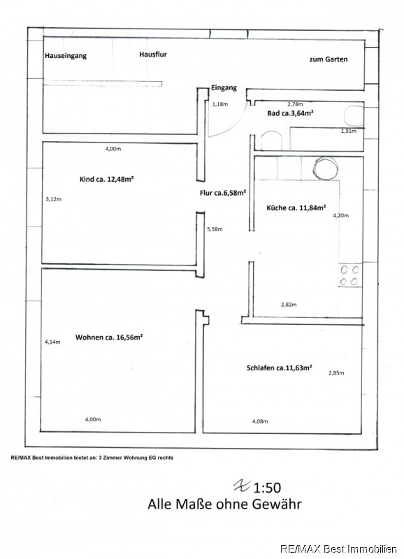 Kleines Mehrfamilienhaus mit 4 Einheiten hat im EGeine wirklich schöne, ruhige 3 Zimmerwohnung frei. Der dazu gehörige Gartenanteil hat ca. 60m² Fläche. Das Haus befindet sich in einem zeitgemäßen Zustand. Die Wohnfläche beträgt ca. 63 m², der Gartenanteil von ca. 60m² wird extra berechnet mit 50,-€/ Monat. Somit beträgt die Kaltmiete 399,- + 50,- = 449,-.